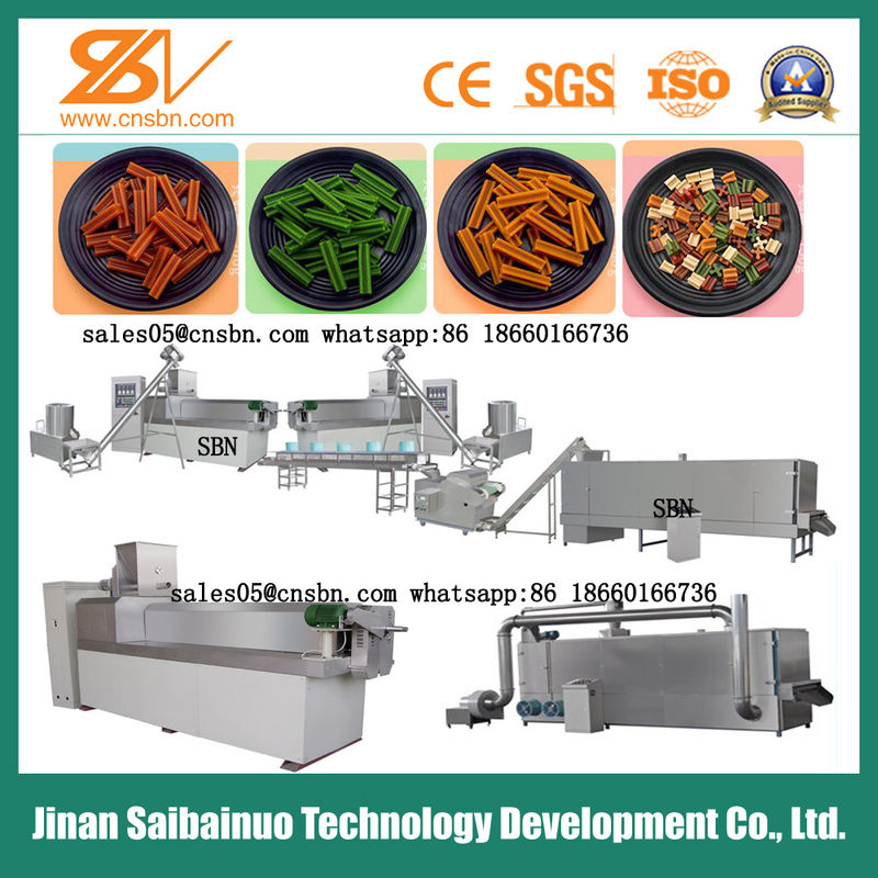 แท่งเคี้ยวสำหรับสุนัขใช้วัตถุดิบแป้งที่มีการกำหนดค่าทางวิทยาศาสตร์และถูกอัดรีดจากเครื่องอัดรีดร่วม สามารถทำเป็นรูปทรงต่างๆ ได้ เช่น แท่ง กระดูก สองสี สองรส ฯลฯ อาหารชนิดนี้ไม่เพียงแต่ให้โปรตีน ไขมัน วิตามิน โภชนาการสำหรับสุนัขเท่านั้น แต่ยังตอบสนองความต้องการตามธรรมชาติของสุนัขอีกด้วย